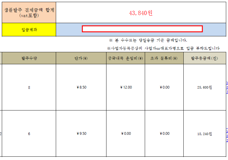 사입하는 물건은 해운배송을 하는데 샘플은 빨리 받아봐야 하기 때문에 항공배송으로 진행한다.
